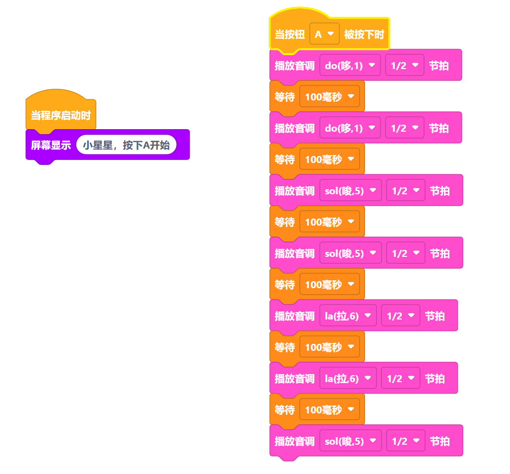 8.音乐盒 任务 按下A按钮,播放“小星星”的曲子。 代码 立即下载! 参考:小星星简谱 相关文章 1.您好,中国! 开机后,屏幕显示“您好,中国”。 2.小徽章 开机后,屏幕显示学生王小虎的个人信息。 3.跳动的爱心 开机后,屏幕是显示跳动的爱心,大爱心编程小爱心,重复这个动作。